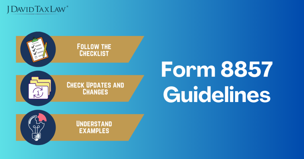- Checklist of Requirements: Form 8857 outlines specific requirements and documentation needed. Ensure you follow this checklist precisely to avoid missing critical pieces of information.