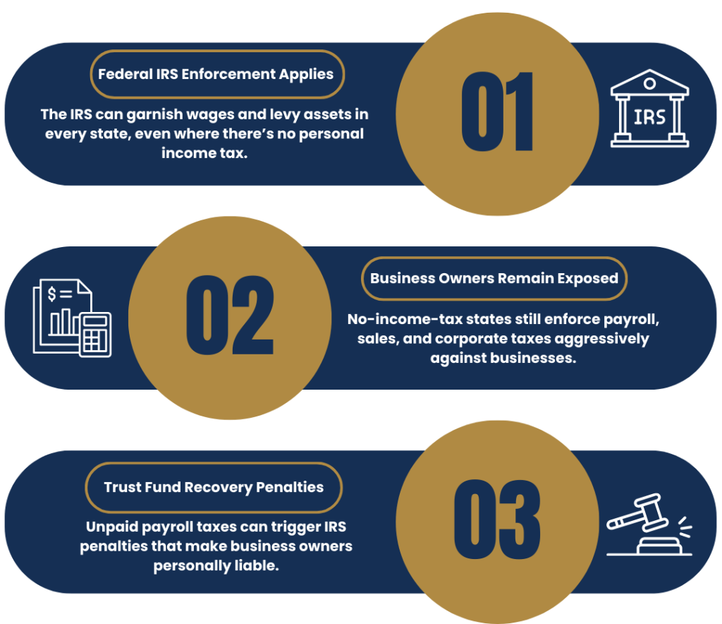 No-income-tax states like Florida and Texas are not exempt, as IRS collections and business-related taxes still create heavy debt.