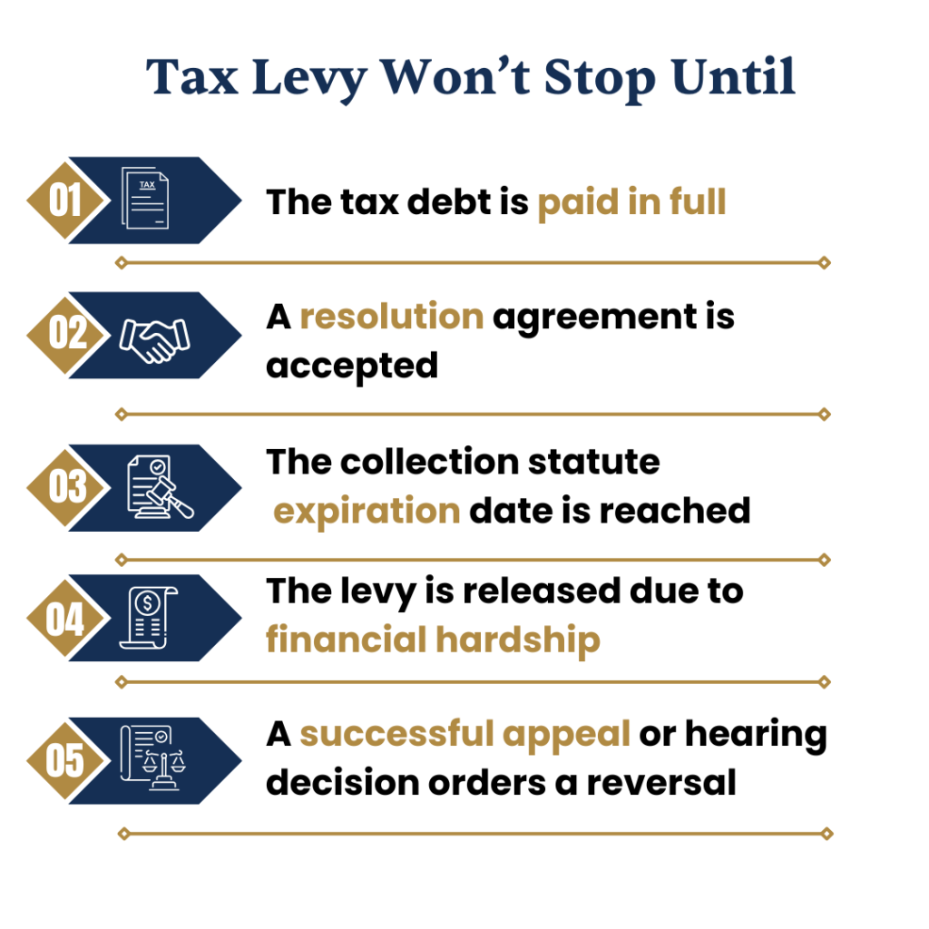 Once in place, a levy remains active until the debt is paid, the statute of limitations expires, or the IRS agrees to release or modify it due to hardship or a successful appeal.